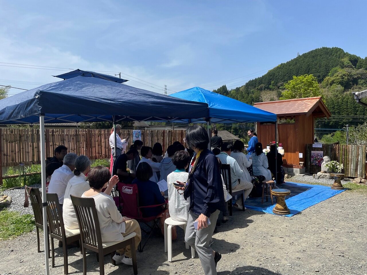 当日は、4月とは思えないほど日差しが強くとても暖かく、良いお天気に恵まれ最高の式典日となりました。午前11時からお水取り場の設立記念式典が始まり、最初に古代縄文舞の木村差代子さんがピンク法螺貝で音開きをして、次に西光禅寺の檀上宗謙和尚がお経を唱えてくださり、それはそれは素晴らしい式典でした。そして午後1時から『水からの伝言』の講演会が始まり、有難いことにこの特別な日、金環皆既日食と新月が始まるまさにその時に私は「水からの伝言」のお話をさせていただきました。