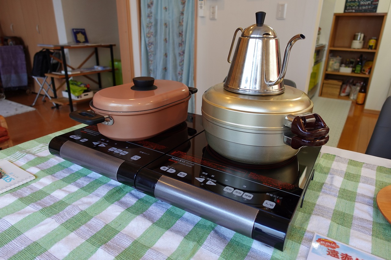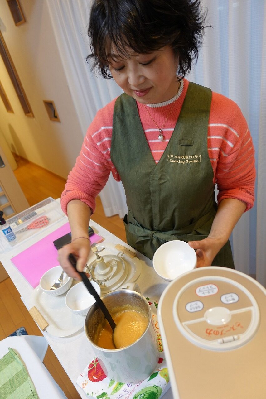 マル球産業さんの「スープの力や遠赤外線調理器」との出会いもほぼ同時期でした。4、5年看病していた愛犬を見取ったので、動きが取れるようになり、お誘いがあって予定がなかったら全て受けることにしました。そうしたら沖縄に行くことになり、メーカー主催のクッキングスクールに参加することになったのです。この時は先生が料理を作り、それを食べるだけでしたが、夜の部では何故かアシスタントをする事になったのです。2回の料理体験で本当に感動して、マル球産業さんの遠赤外線調理器をフルセットで購入してしまいました。笑